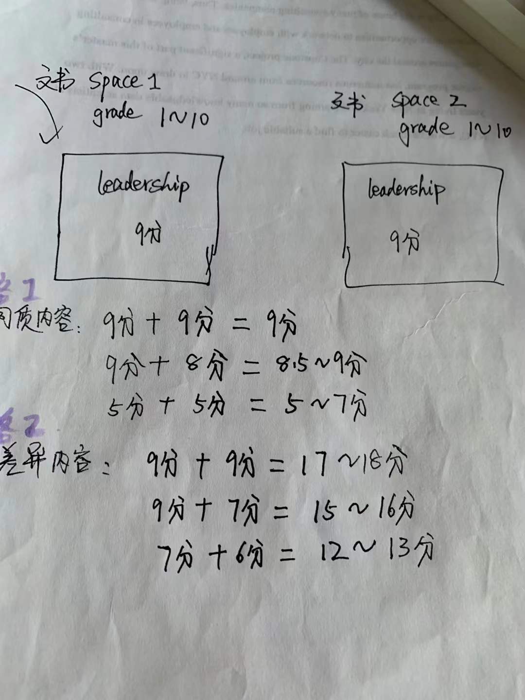 竞争者分析:很多人会陷入personal success的怪圈,抓住这350words当detailed SOP来写,这本身违背了(2 Don’t showcase yourself aggressively)。如果在这宝贵的350 words里讲a specific leadership example,那么这个空间与CV和2RL空间重复了,任何一个模块得分有其上限,我们假如leadership这方面评分是0-10,一个9分leadership example + 另一个9分leadership example,其总分不可能超过上限10分。(图2)