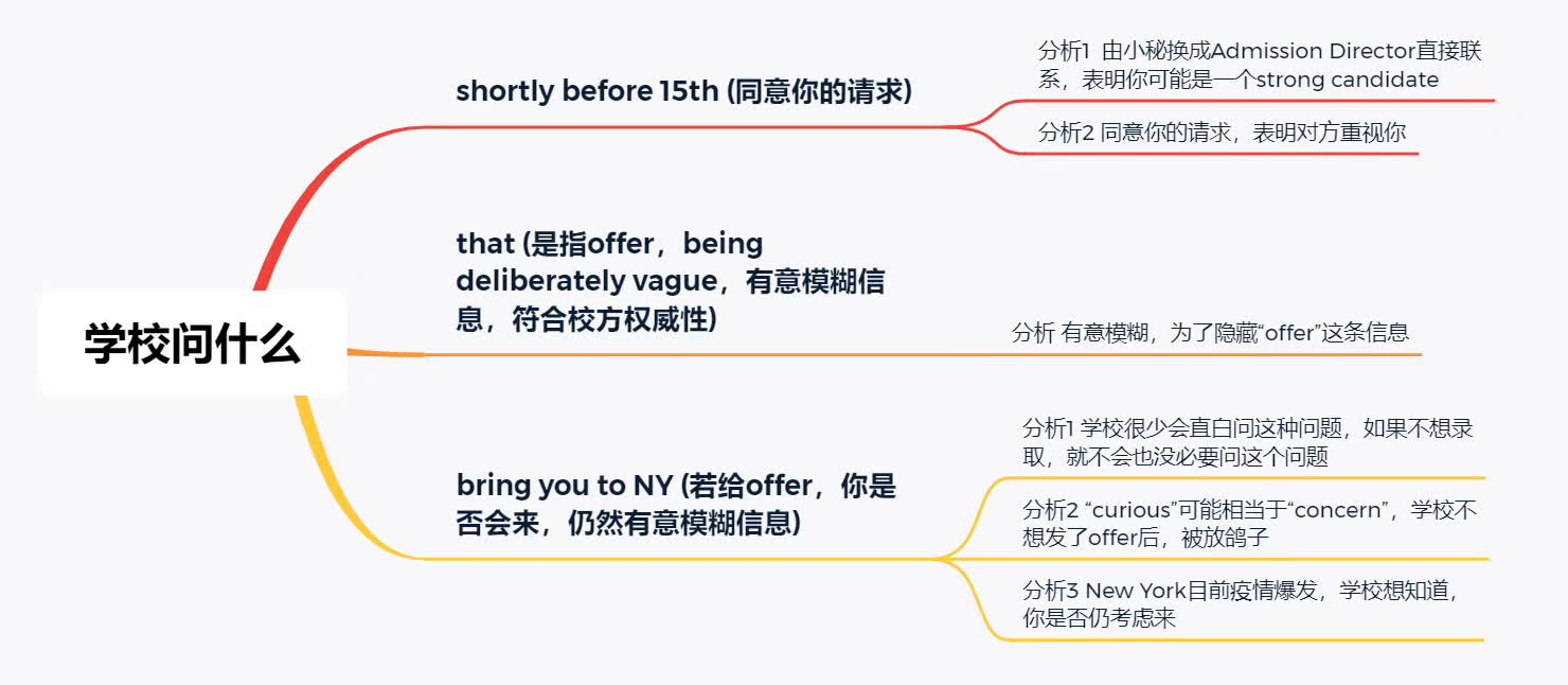问题是学生目前已有offer,其中一个要求15号前交deposit,这与dream school发offer的时间冲突。于是如实告之小秘,然后就收到第二封邮件,是admission director亲自发来的(图1)。 图2是邮件解析。